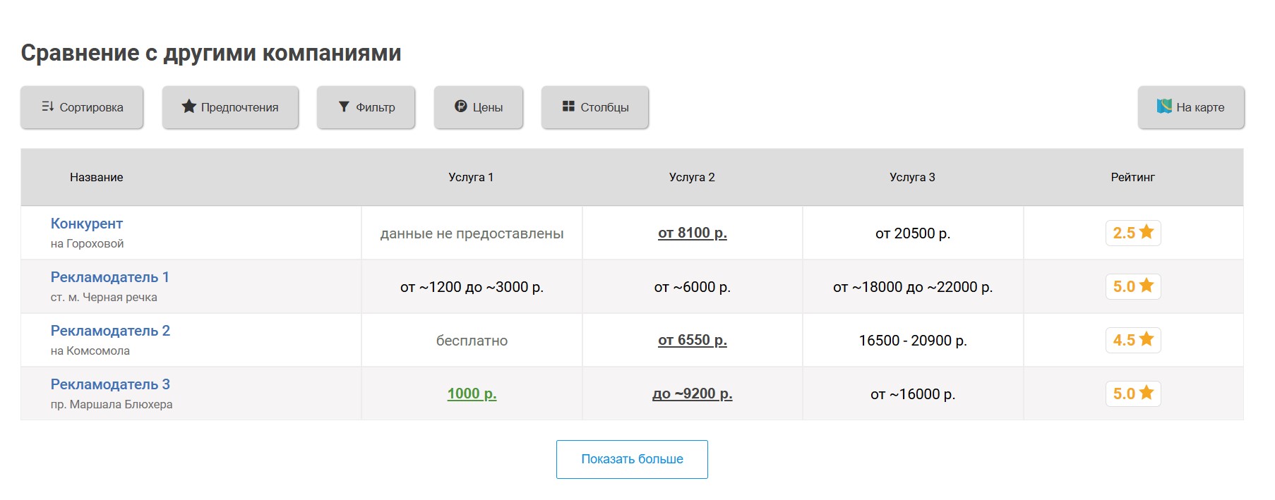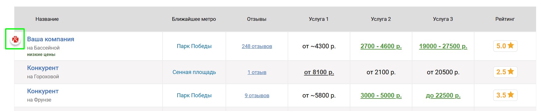 Вокруг продвигаемой таким образом клиники выбирается некоторое количество ближайших конкурирующих клиник, продвигаемая клиника попадёт к ним в таблицу «Сравнение по ценам», которая выглядит следующим образом: